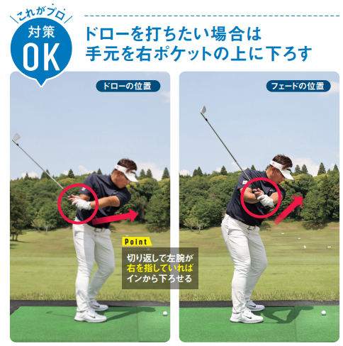 切り返しの手元の位置によってドロー、フェードの軌道が決まる。打ちたい球筋があれば、この形になるように逆算することが大事