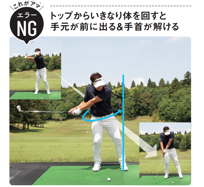 これがアマ!エラーNG:トップからいきなり体を回すと手元が前に出る&手首が解ける