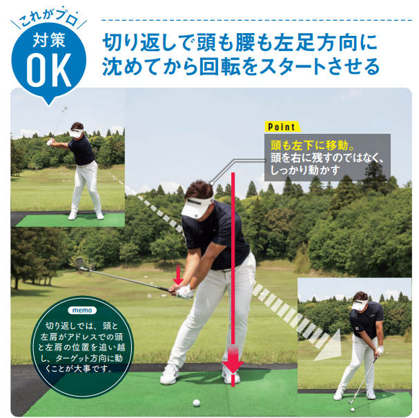 これがプロ!対策OK:切り返しで頭も腰も左足方向に沈めてから回転をスタートさせる