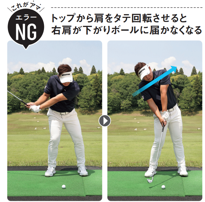 これがアマ!エラーNG:トップから肩をタテ回転させると右肩が下がりボールに届かなくなる