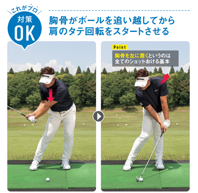 これがプロ!対策OK:胸骨がボールを追い越してから肩のタテ回転をスタートさせる