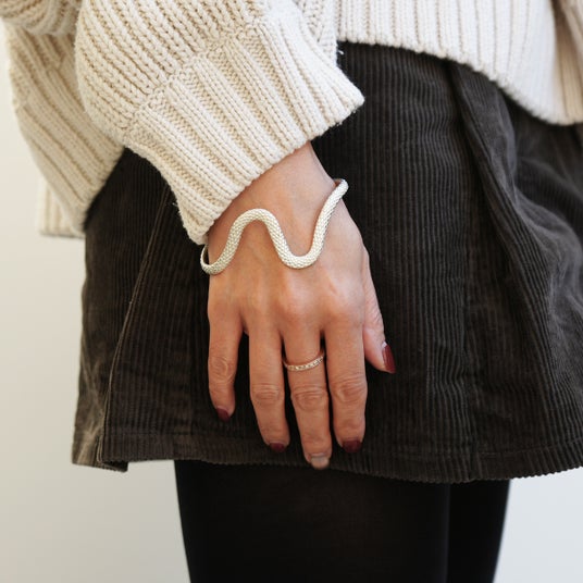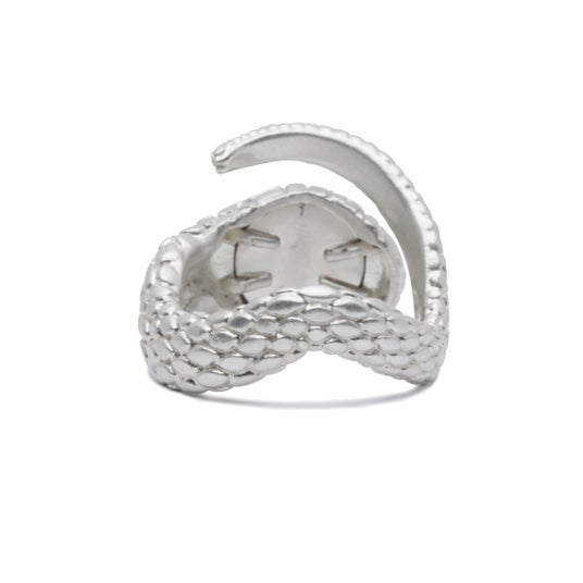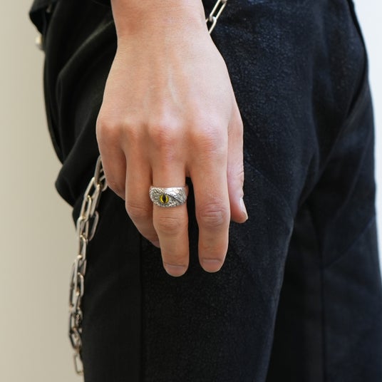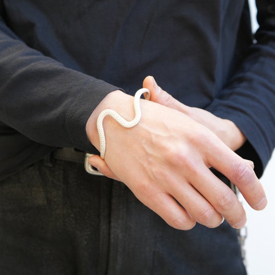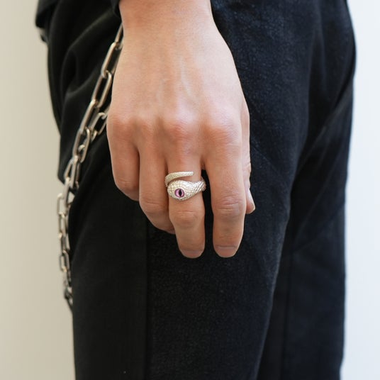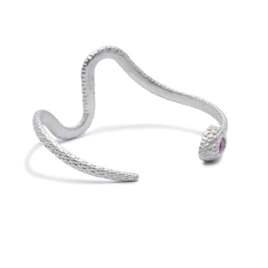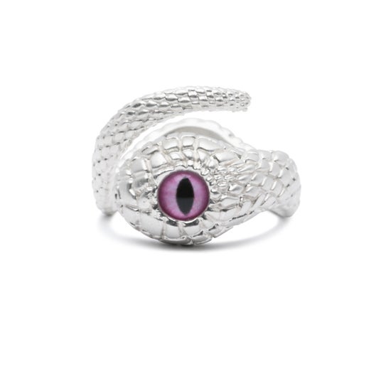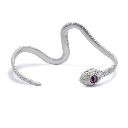 巳年にちなんで、「神様の化身」と言われ、幸運を呼ぶ白へびをモチーフにした、シルバー925製の指輪とバングルです。へびの目に見立てた義眼(ドールアイ)を配し、シルバーに白仕上げを施しました。