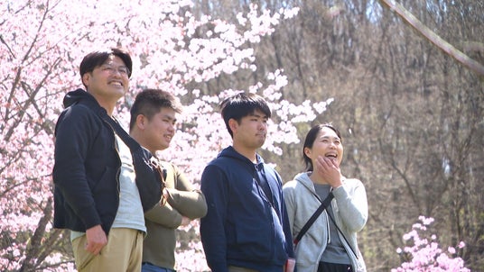 桜を楽しむ九内 康夫さん・長男の誠洋さん・次男の勇輝さん・妻の知子さん