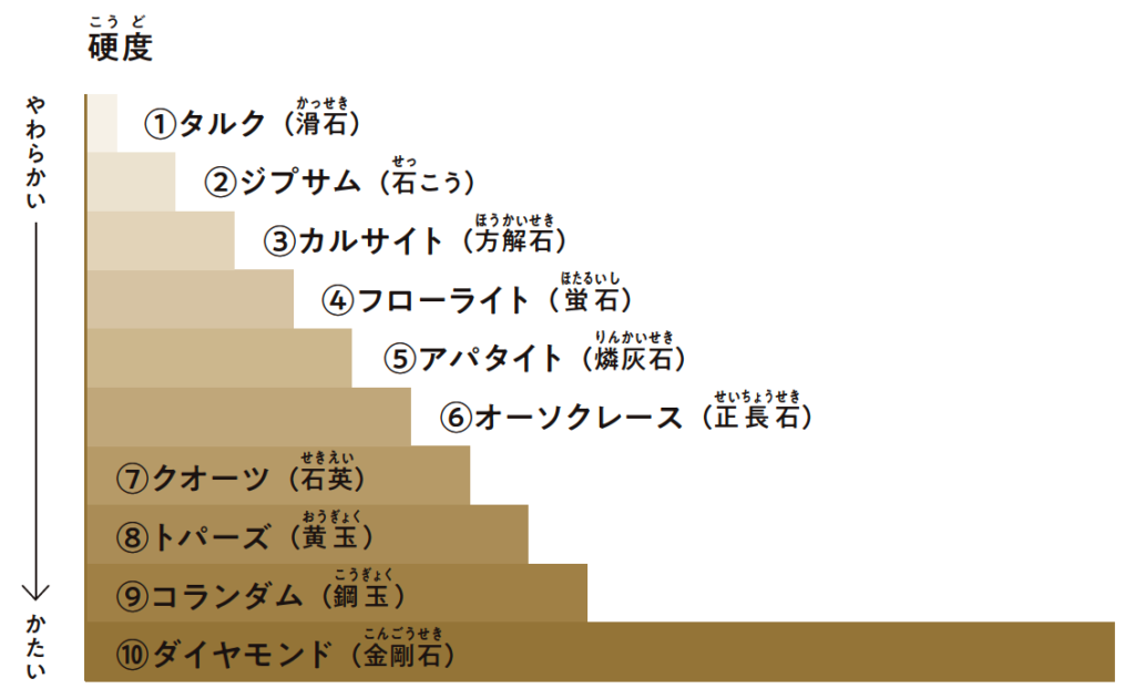 ドイツの鉱物学者フリードリッヒ・モースは、10種類の鉱物を基準にしてきずつきやすさを表しました。ダイヤモンド(硬度10)は、ルビーやサファイア(硬度9)の何倍もきずつきにくいことがわかっています。