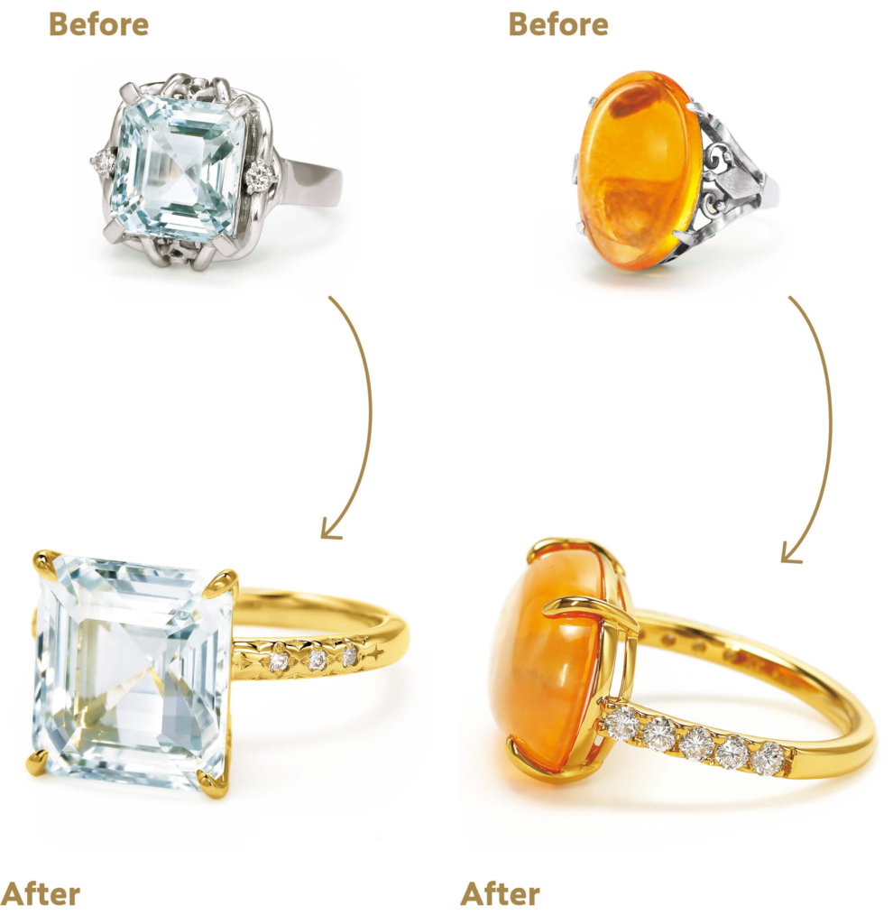 でも、ちょっと形を変えて、ちがうジュエリーにしたいとき、リフォームをする方法もあります。宝石を留めている金属をかえたりすると、またちがったジュエリーに生まれ変わります。