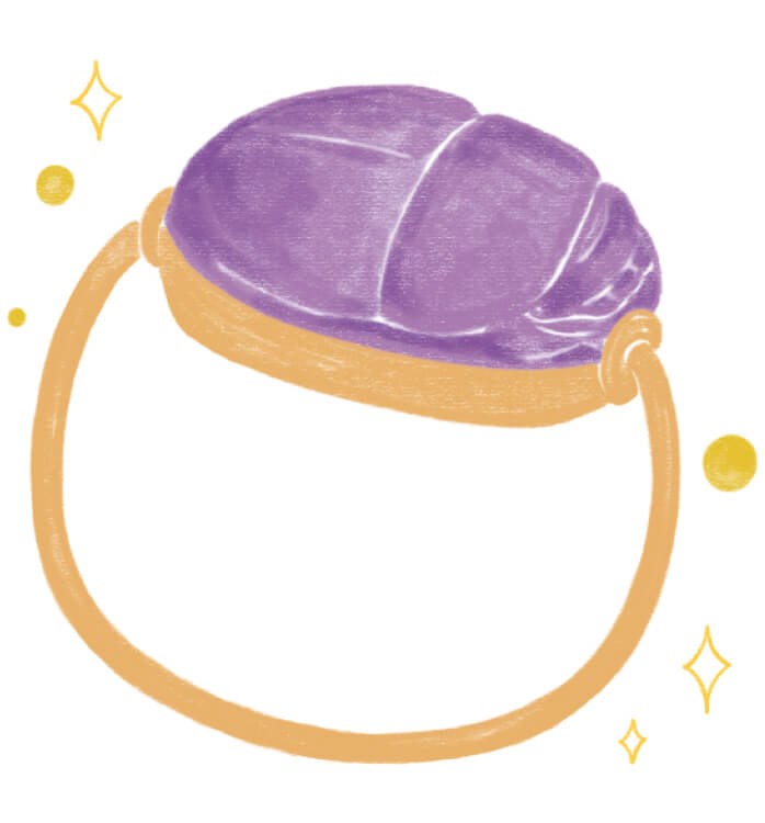 古代エジプトでは、女王クレオパトラのエメラルドなどの宝石にまつわる数々の逸話があります。また、アメシストでつくられたスカラベの指輪も有名です。スカラベとはタマオシコガネという虫のこと。動物のふんを丸めてころがす姿から、「フンコロガシ」というよび名もあります。古代エジプトでは太陽の神様の象徴と信じられてきました。