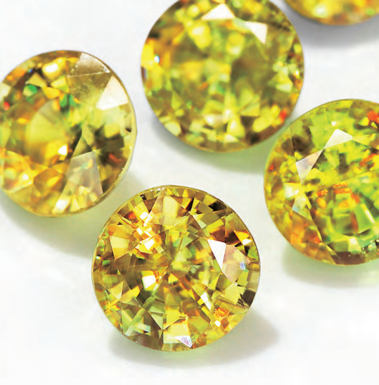 褐色、黄色、緑色とカラーが豊富にあります。さらに、光に当てると、カラフルな虹色に輝きます。これは、石を通りぬけた光が虹のように分かれる「ファイア」という現象(光の分散)です。