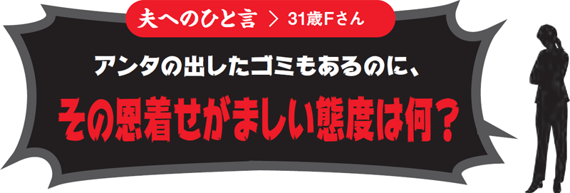 朝バタバタしていて忘れていたゴミ出しをたまたまやった夫のひと言。妻が夜のうちに翌朝捨てようと思って玄関に置いていたゴミ袋を見て、夫としては気を利かせたつもりなのでしょう。ところが、いかにも面倒くさそうな表情を浮かべつつ、「本当はオレの仕事じゃないけど我慢してやったよ」という態度だと、妻の心にあった感謝の気持ちなど一瞬にして吹き飛んでしまいます。