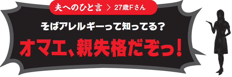 終日、義母とともに子どもの世話を任された夫が、その日の報告を妻にした際のひと言。子どもがはじめて口にするものには細心の注意を払うのは親として当然のことなのに、アレルギーを招きそうなそばなどの食品をはじめて食べさせることに何の疑問も不安も感じない無知さ加減と無神経さをさらした夫。ひとつ間違うと子どもの命に関わるだけに、笑いごとではすまされません。