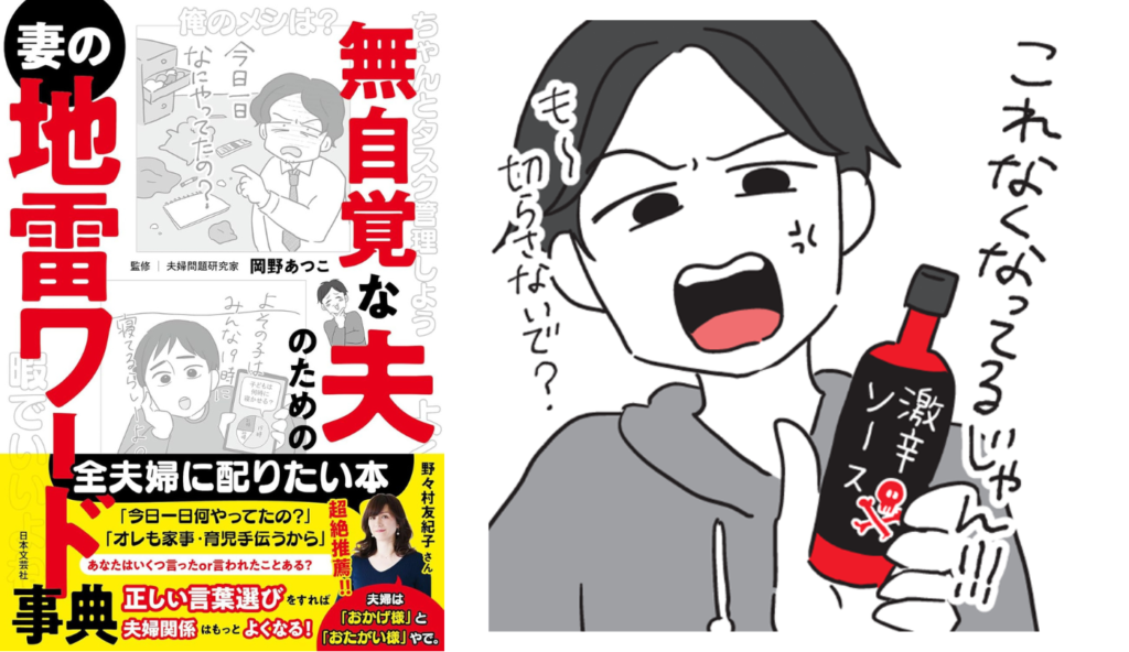 男性側からの「今日一日、何やってたの?」「俺も家事とか育児とか手伝うから」などを始め、「言ってくれればやったのに」といった主体的に考えていないような発言や、「イクメン」「家族サービス」など、『地雷単語』が入ったワードもたっぷりと掲載します。