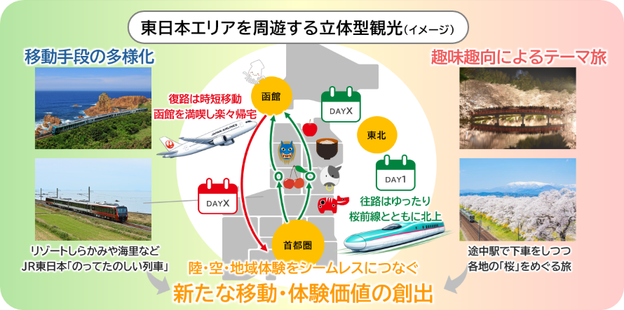 首都圏のお客さまの移動体験や周遊意向など多様なニーズを検証するため、2026年4月から9月の間、JTBの首都圏※3店舗で首都圏発~東日本エリア着の商品を「鉄道+航空」の立体観光型にカスタマイズして販売します。お客さまのニーズに応じて、往路・復路で鉄道または航空を選ぶことができます。また、商品をおトクに購入できる旅行クーポンの配布キャンペーンも実施します。適用要件など、詳細はJTBの対象店舗にてご確認ください。
