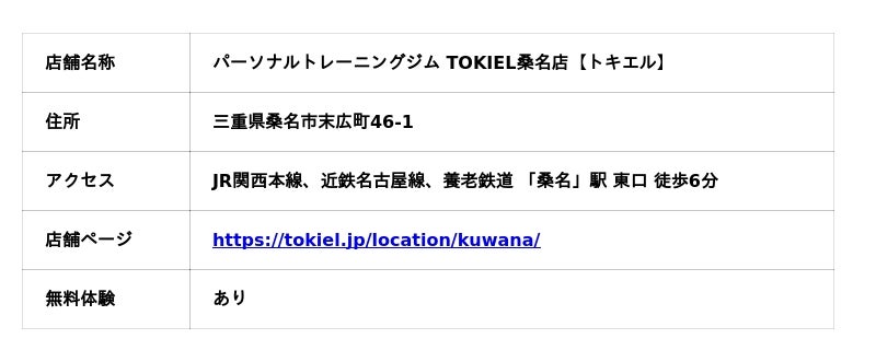 「運動習慣をつけ、美しく健康な身体に導く」がコンセプトのパーソナルトレーニングジム『TOKIEL 【トキエル】』を展開する株式会社TIU(本社:東京都台東区、代表取締役 篠田拓也)は、2026年3月5日にJR関西本線、近鉄名古屋線、養老鉄道 「桑名」駅 東口 徒歩6分(住所:〒511-0077 三重県桑名市末広町46-1)に『パーソナルトレーニングジム TOKIEL桑名店【トキエル】』がオープン。