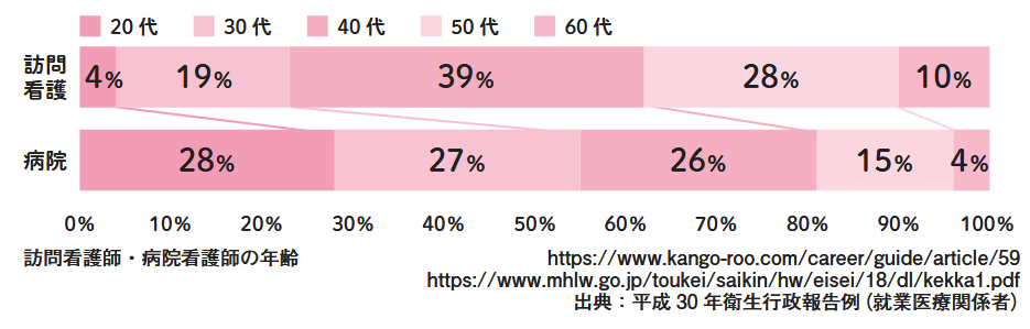 訪問看護師として働く看護師は40代が多く、全体の約4割を占めています(2018年時点)。近年では、「臨床経験を問わない」「新人や若手積極的に採用している」ステーションも増えてきています。臨床経験が浅くても、教育体制の整っているステーションを選んで働いてみてはどうでしょうか。
