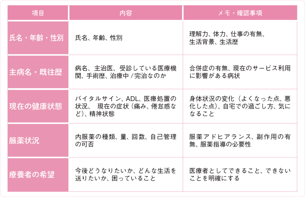 療養者の自立支援と生活の質の向上を目指し、多職種が連携して最適なケアプランを作成・見直しするため、情報を整理・確認しておきましょう。
