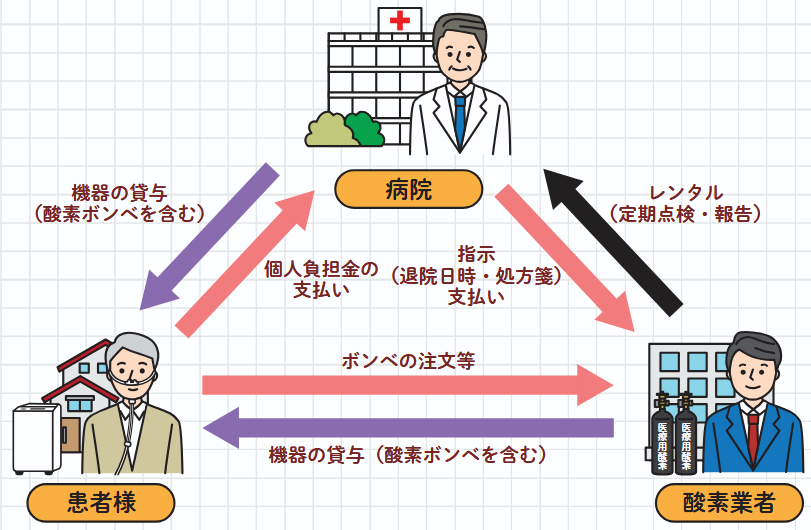 在宅酸素療法の導入は、医師の判断により行われます。費用は保険適用となりますが、そのためには月1回は医師の診察を受ける必要があります。酸素量は医師の処方で決定されます。訪問看護指示書に記された指示内容と流量を守りましょう。