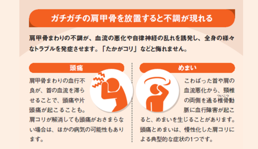 ズレてガチガチになった肩甲骨が、首や肩まわりのコリや痛みに拍車をかけ、症状をこじらせる元凶になっているといえるのです。