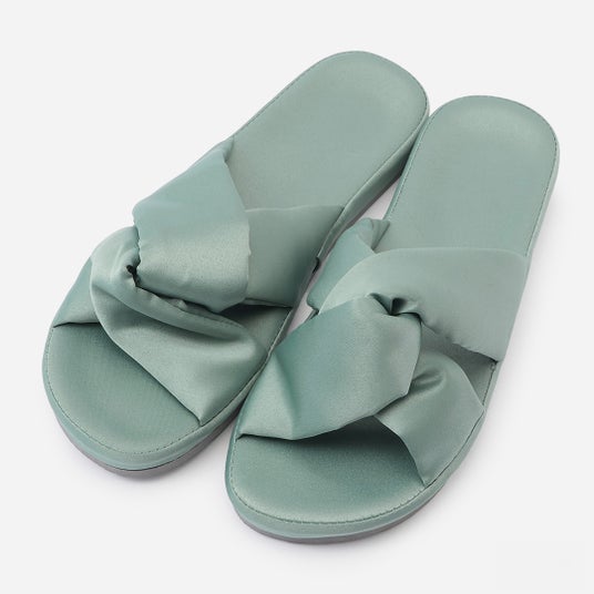 ■土踏まずUPで履き心地◎のきれい見えスリッパ「ルームサンダル サテン」足裏に沿う凹凸の中敷きが特徴で、土踏まずをしっかりサポートします。通気性抜群の甲部分は足にフィットし、快適な履き心地を提供します。