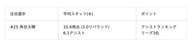 佐賀の攻撃の起点は、リーグ3位の平均6.1アシストを誇る#25 角田太輝選手(※)。彼に自由なプレーを許さず、チーム全体で連動してパスコースを遮断する強固なディフェンスが不可欠です。相手に得意な形を作らせない守備の遂行力は、勝利への絶対条件となります。
