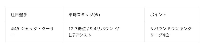 守備でリズムを掴んだ後、勝機を確実にするのがインサイドの攻防です。ここで鍵を握るのが、平均リバウンド数9.4でリーグランキング4位と圧倒的な存在感を放つ#45 ジャック・クーリー選手(※)。強みを最大限に発揮し、セカンドチャンスから得点へ繋げ、試合の主導権を握ることも重要となります。