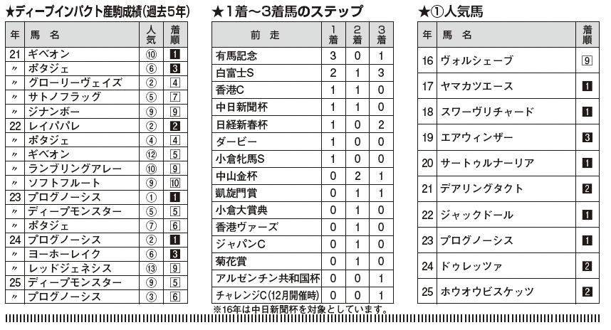 GⅠクラスがその年の初戦で使うことも多く、前年秋のGⅠ組が[3・2・1・16]と強く、中でも有馬記念組が[3・0・1・10]と主力を形成。