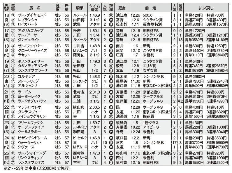 シンザン記念組[1・1・0・2]と東京スポーツ杯2歳S組[1・1・0・1]の成績もいいが、核となる個別のレースがない状況である。