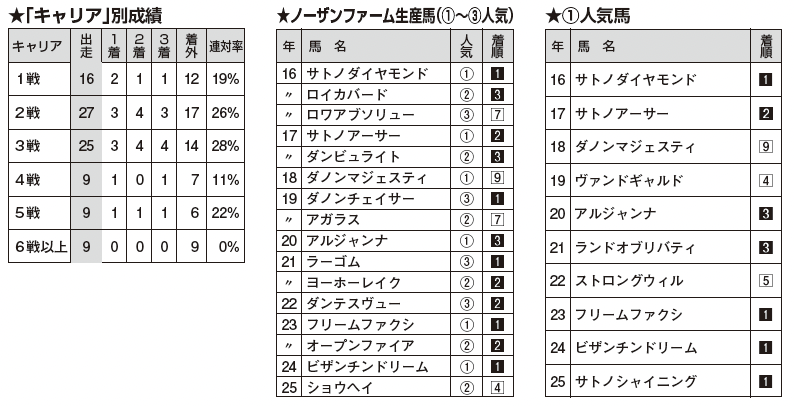 続いて[2・1・1・12]の新馬組。前走GⅠ組が[2・1・3・9]、前走GⅢ組が[2・1・1・9]、前走GⅡ組が[1・1・0・2]と重賞組は総じて好調。