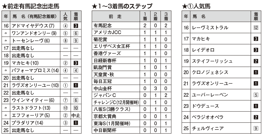 好走率の高さで菊花賞組[1・1・0・1]、海外GⅠ組[2・1・1・1]あたりが目立ち、3着以内30頭中29頭を前走重賞組で占めていることから格は重視したい。