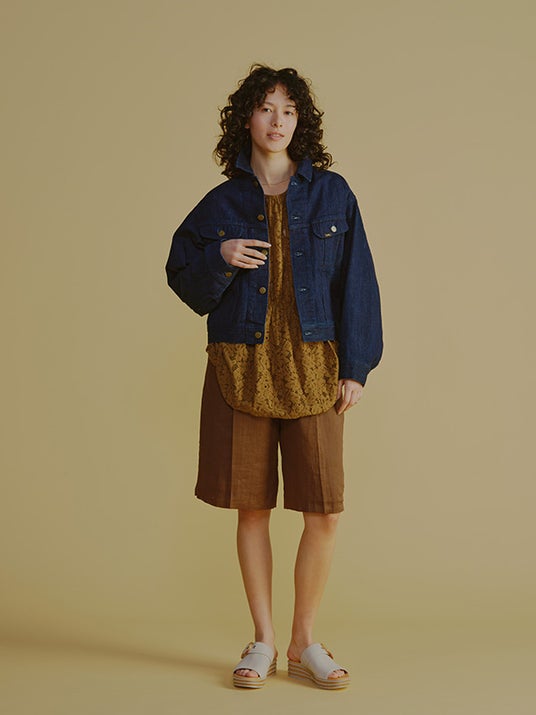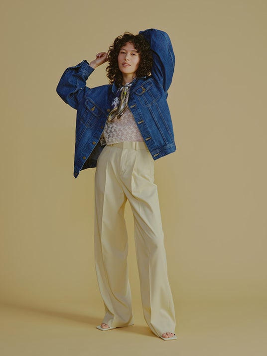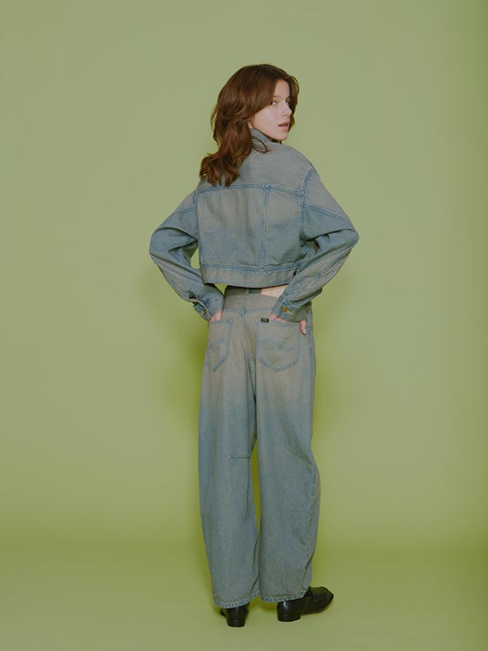 トレンドのクロップド丈と、ヴィンテージの感あるカラーリングがかわいいデニムジャケット。デニムパンツとのセットアップがおすすめです。