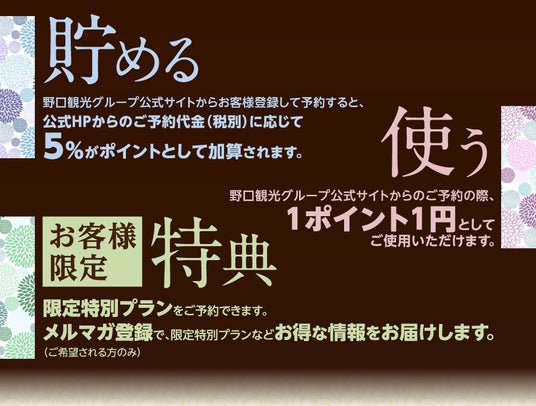 野口観光グループ公式サイトからお客様登録してご予約いただくと、公式HPからのごご予約代金(税別)に応じて、5%がポイントとして加算されます。