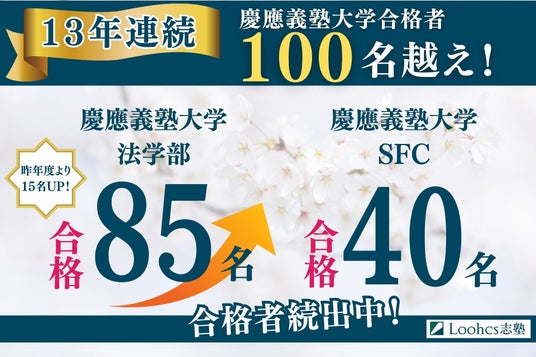 Loohcs株式会社(代表取締役 :嶺井 祐輝 本社所在地: 渋谷区桜丘町)は、同社運営の総合型選抜・AO推薦入試の学習塾「Loohcs志塾」において、今年の慶應義塾大学の合格者数が合計125名を達成しました。特に、慶應法学部85名(昨年度より15名増加)、慶應SFC40名という結果は、現役大学生講師による実践的な指導と、受験生一人ひとりに合った講座や演習の成果と言えます。またLoohcs志塾は、13年連続で慶應義塾大学合格者100名以上を輩出し、不動の実績を誇っています。
