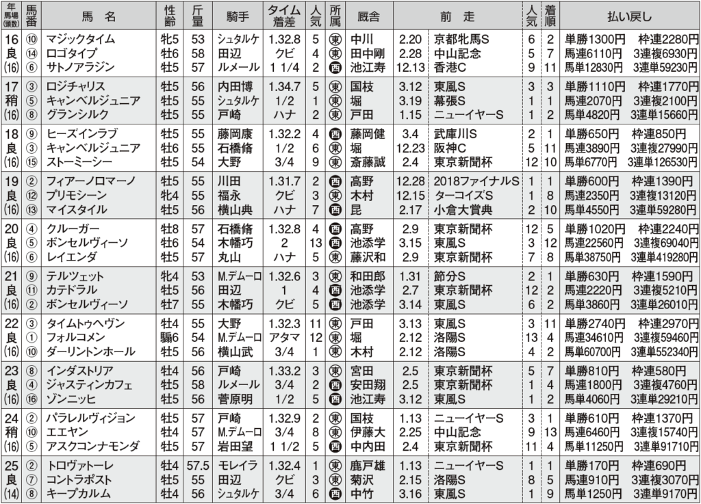 複数の優勝馬を輩出しているレースは東京新聞杯組[2・2・3・18]、OP特別の東風S組[2・1・3・23]、そして24~25年に連勝しているニューイヤーS組[2・0・1・4]。