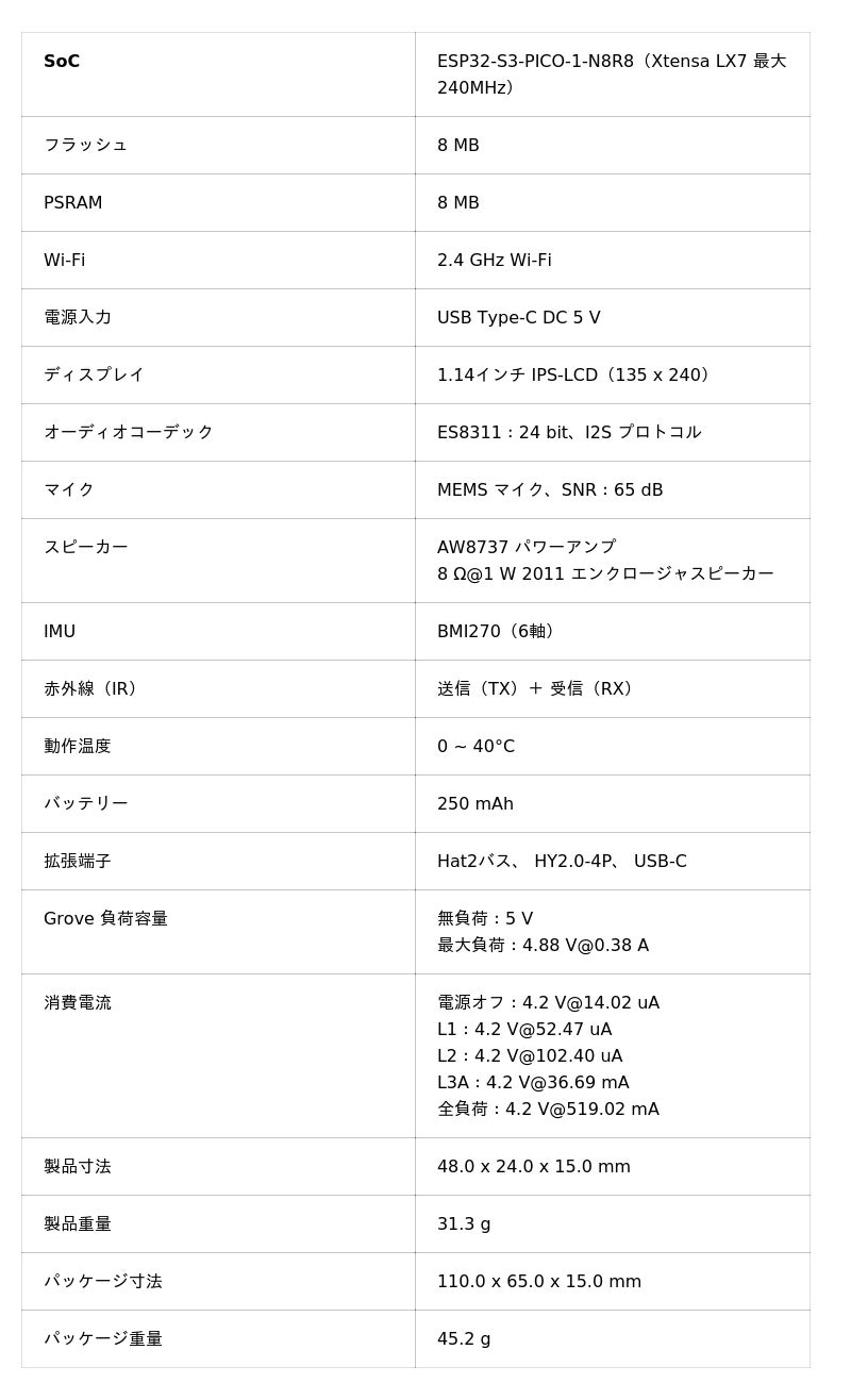 ハードウェア面では、1.14インチディスプレイや6軸IMUセンサ、プログラマブルボタンといった定評あるHMI(ヒューマンマシンインターフェース)を維持しつつ、特にオーディオ回路を強化。ES8311コーデックと高感度MEMSマイク、そしてAW8737パワーアンプの組み合わせにより、クリアな音声キャプチャとハイファイ音声出力を両立しました。この進化により、AI音声アシスタントとの対話や音声認識といったインタラクティブな体験を実現します。IR送受信機能や250 mAhのリチウム電池も内蔵しており、直感的なUI操作によるスマートホームの制御、独創的なAIデバイスの開発など、エンジニアの想像力を形にする幅広い開発シーンでの活用が可能になりました。