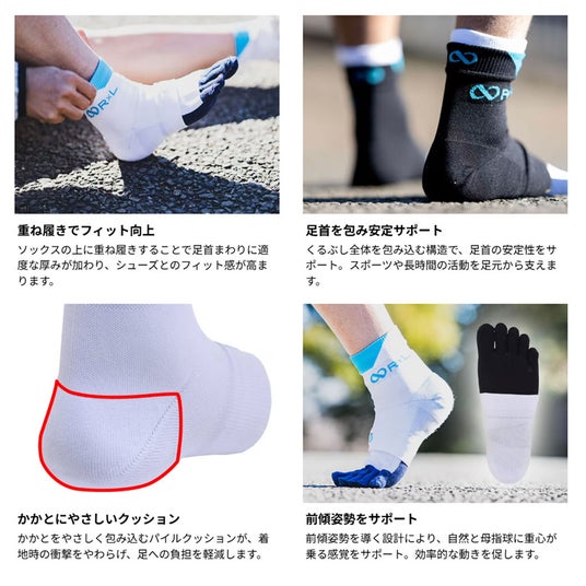 「素足感覚」にこだわるR×Lとして、足首への負担を軽減し、シューズとの一体感を高めることで、安心して走れる状態をつくりたい――そうして生まれたのが「anklecore(TM)(アンクルコア)」です。