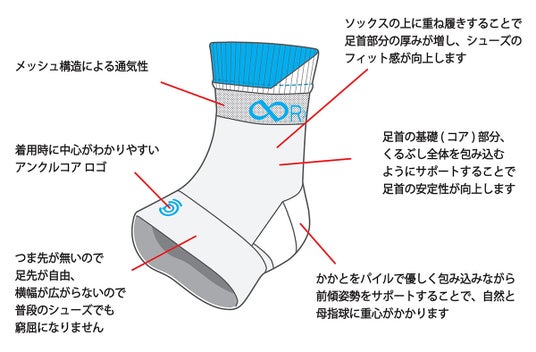足首は、ランニングはもちろん、あらゆるスポーツの動きの基礎(コア)となる重要な部位。 その足首を適度にサポートすることで、姿勢が安定し、無駄な力を使わず、長時間にわたるパフォーマンスの持続につながります。