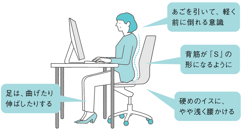 イスにはやや浅く腰かけ、あごを引いて背筋を保ったまま、ほんの少しだけ前に倒れるような意識で、デスクに向かうとよいでしょう。