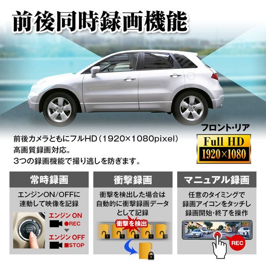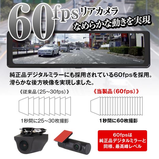 フロントカメラがセパレート、リアカメラは拡大・縮小機能搭載 リアカメラに60psを採用。非常に滑らかな映像を録画可能。またフロントカメラは分離式なので、 カメラの向きに影響を受けることなく、ミラー本体をお好みの角度に調節可能。 リアカメラには拡大・縮小機能も搭載し、距離感がつかみやすくなります。
