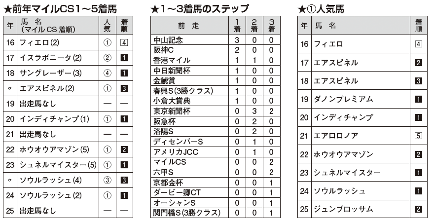 勝利はすべて20年以降のもので近年のトレンドといえる。また、阪神C組も[2・0・0・0]と好相性。