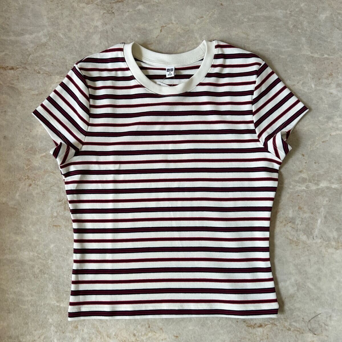 身長160cmでMサイズを着用するとこのような大きさ。ミニTなのでぴたっとラインが目立ちすぎるかなと不安があったのですが、思っていたよりも窮屈感はありませんでした。 ユニクロミニTの着丈とスカートのバランス ほどよくフィットするシルエットと短めの丈感は、ワイドパンツやふわりと広がるスカートともバランスが取りやすく、自然とスタイルアップを叶えてくれます。 ユニクロミニTの袖と肩まわりを横から見たシルエット マルチストライプは1枚で着ても地味見えせず、コーデのアクセントとしてしっかり活躍。ネイビー×赤の配色が青み寄りではっきりしているので、ブルベ冬さんはそのままクリーンに着こなしやすいかなと思いました。キャップ×スニーカーでスポーティに、ジャケット×ロングスカートできれいめにと、振り幅も大きいので、「今日は何着よう?」と迷う日につい手に取りたくなる1枚です♡