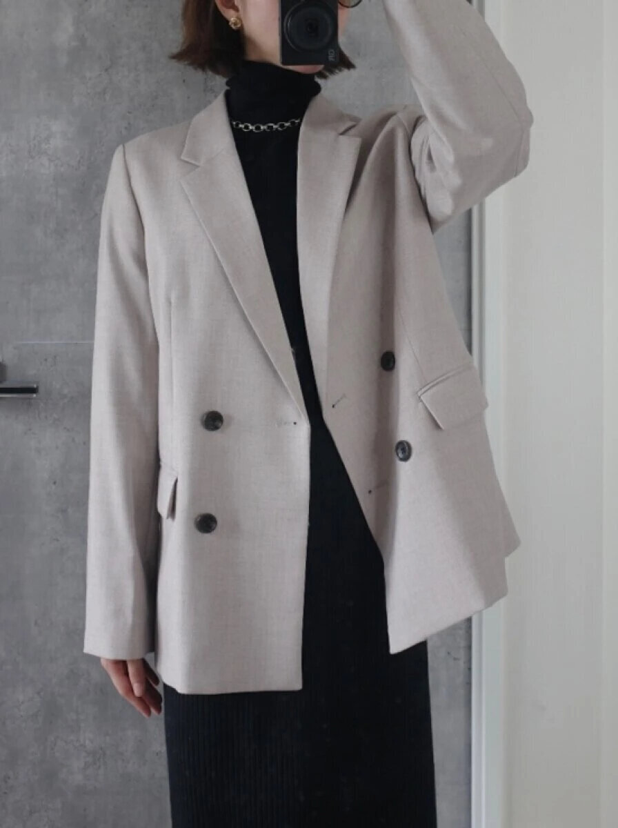 guダブルブレストジャケットベージュ黒ワンピースコーデ シンプルな黒ワンピースにさらっと羽織るだけで、春のフェミニンコーデが完成。きちんと感のあるジャケットも、ほどよくカジュアルな素材感で堅くなりすぎず、自然な抜け感が生まれます。