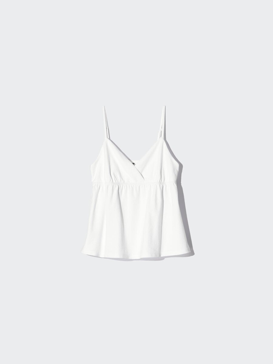 胸下からふわっと広がるデザインが大人可愛いギャザーキャミソール。凹凸感のある素材が表情をプラスし、シンプルながらも着映えする1枚です。ストラップは長さ調整が可能で、1枚でもレイヤードでも活躍してくれます。