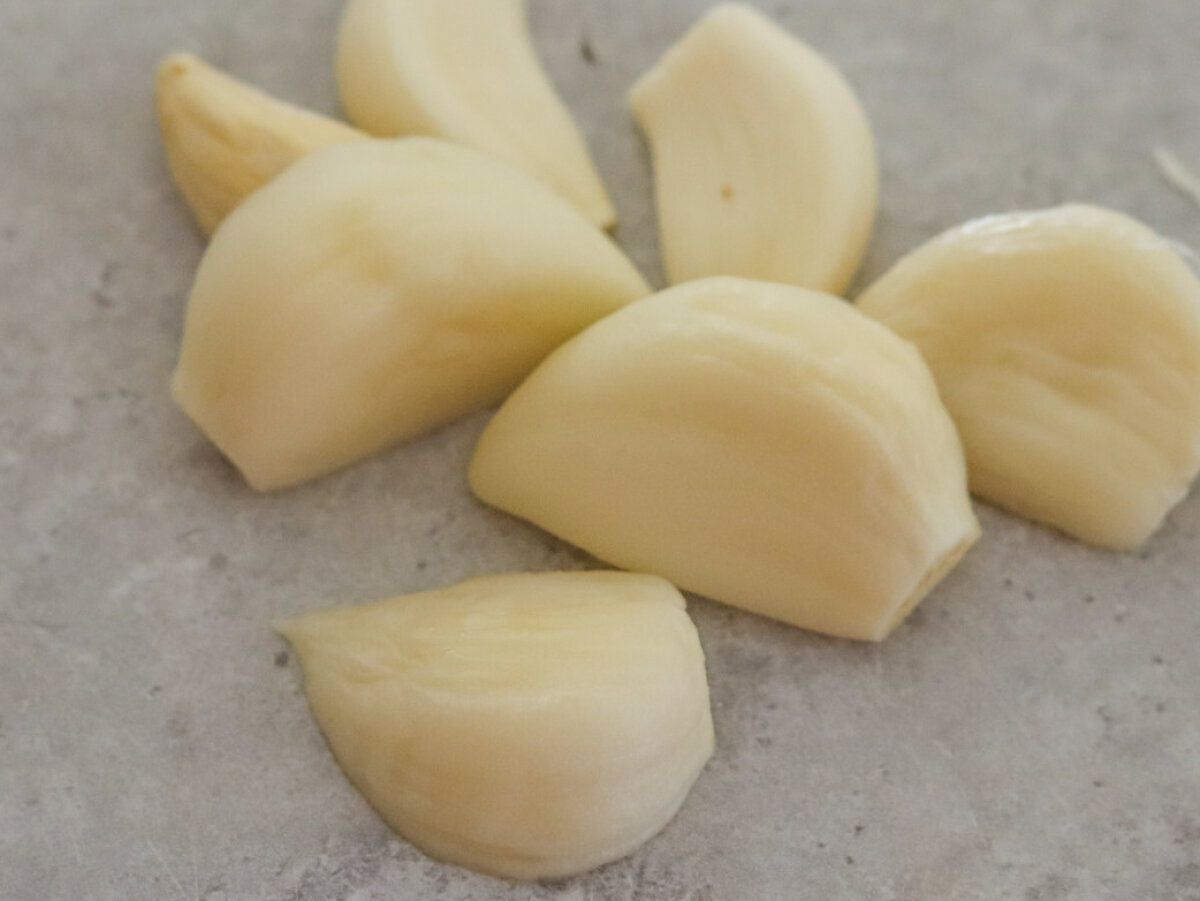 ① にんにくは皮をむいて、ひとかけを半分に切る。