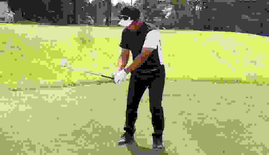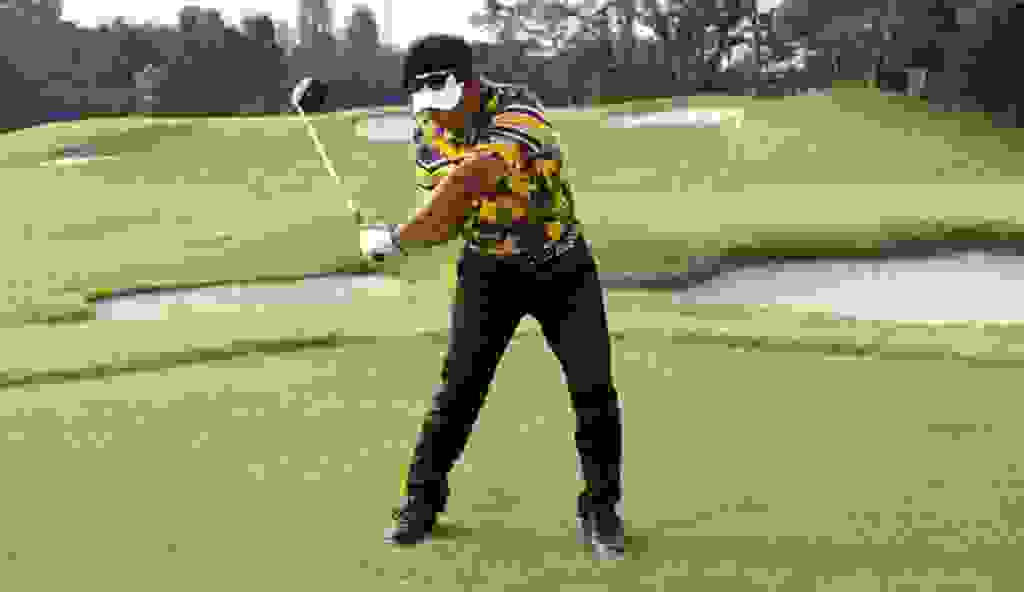 クラブの動きのポイントは2つあります。1つめはクラブを振り子のように動かすこと。グリップエンドをつまんで左右に動かすとクラブは振り子運動を始めます。これがクラブの基本的な動きであり、右から左に動くときに手元を下げることでクラブヘッドはより加速します。これはいわゆる「タメ」といわれるもので、クラブに遠心力を利かせつつ、ダウンスイングでタメを作ることでクラブヘッドが加速することを知ってください。
