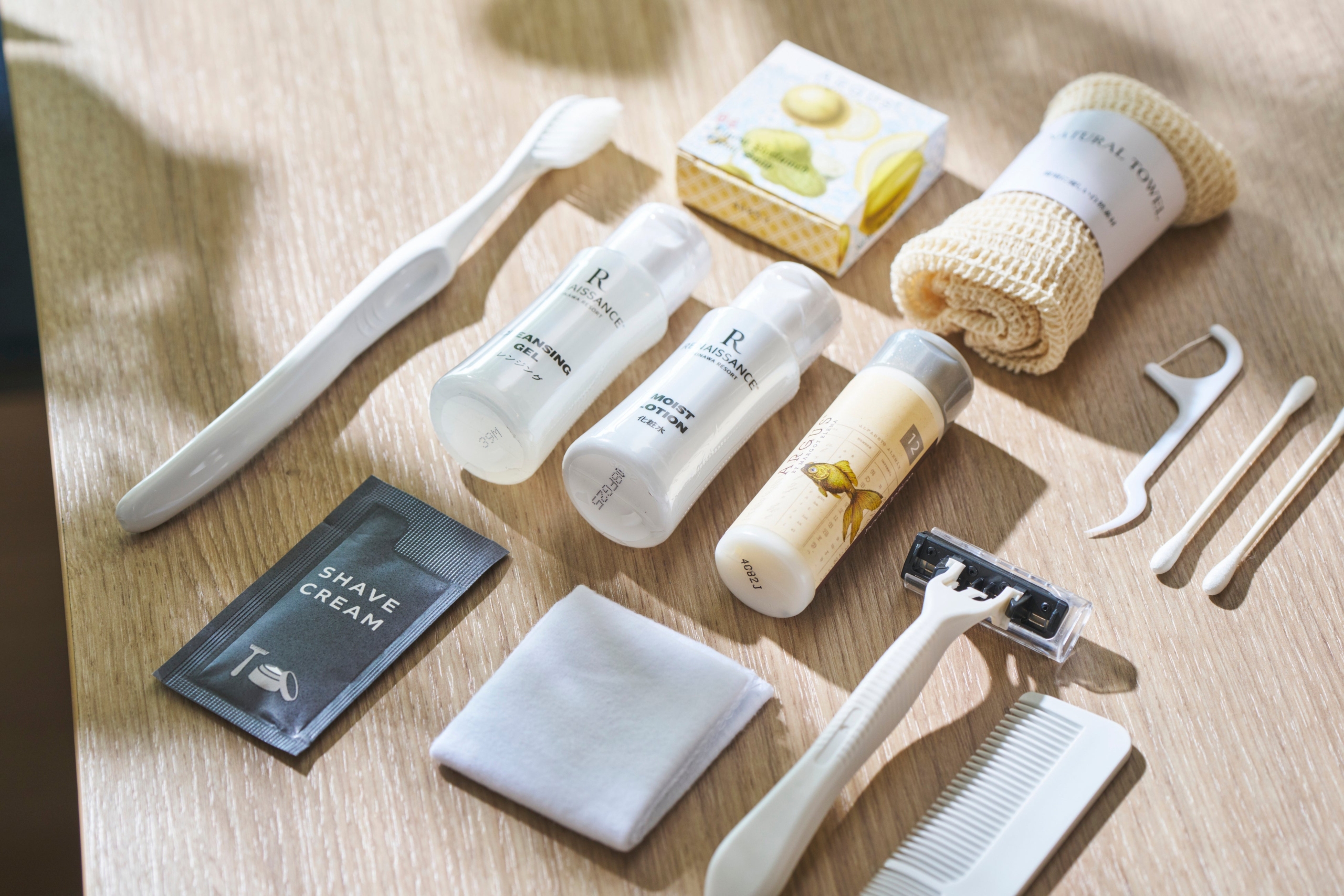 ルネッサンス リゾート オキナワでは、環境配慮型のアメニティを導入しています。歯ブラシやヘアコームにはリサイクルプラスチックを100%使用し、綿棒には持ち手部分に紙素材を採用。また、パッケージにはFSC認証を取得した紙素材を使用することで、プラスチック使用量の削減を実現しています。