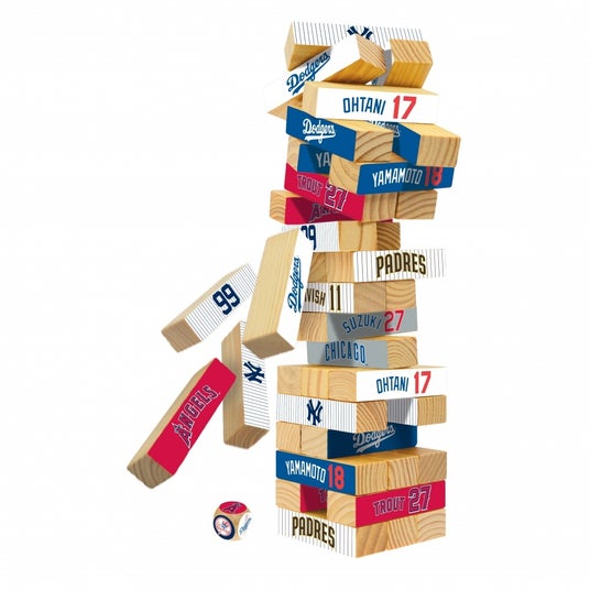 ◆MLBタンブリングタワータワーが崩れないように木製ブロックを抜いて積み重ねていくゲーム。ブロックにはチームや選手の名前がデザインされていて、サイコロを振って出たチームのブロックを抜いていきます。