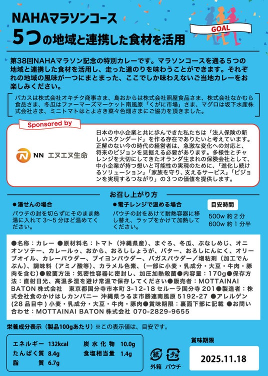 2015年から毎年NAHAマラソンのスポンサーを務めるエヌエヌ生命は、NAHAマラソンを完走したチャリティランナー1人につき1万円を県内の児童養護施設に寄付する取り組みを行っています。今年は沖縄への貢献を高める新しい試みとして、沖縄の食材を活かしたレトルトカレーの製造をモッタイナイバトンに依頼しました。
