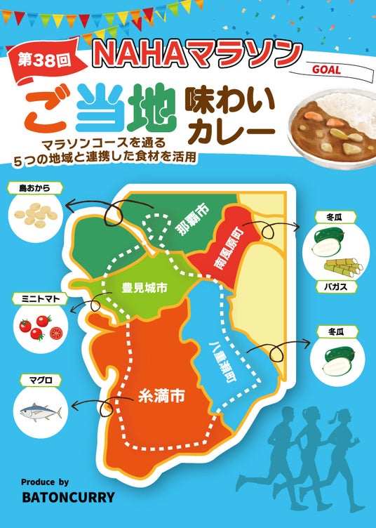 ランナーが走るエリアで生産されている食材の選定やカレーの製作はモッタイナイバトンが行い、コース沿道の3市2町(那覇市、糸満市、豊見城市、南風原町、八重瀬町)の野菜や魚が入ったご当地レトルトカレーが完成しました。
