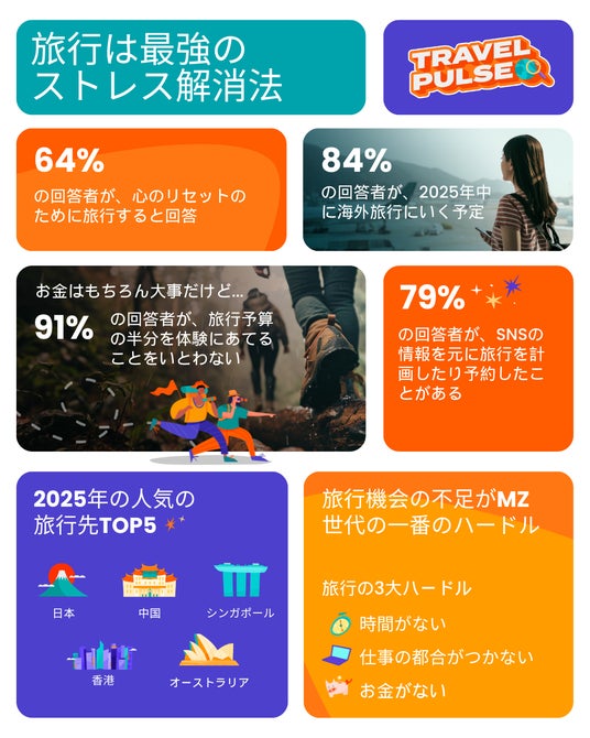 世界をリードする旅行・レジャー予約サイトKlookは、世界14市場の7,100名の18歳~41歳の旅行に関心のある男女を対象に、旅行に関するアンケート調査「Klookトラベル・パルス・サーベイ」を実施しましたので、結果を発表します。回答者のほぼ全員が旅行を強力なストレス解消法と考えていることが明らかになった一方で、10人中9人が、時間の制約や仕事の都合、経済的な懸念といった障壁により、必要な旅に出られず不満を感じていることがわかりました。MZ世代はセルフケアの重要な手段として旅行を強く求めていますが、思うように旅に出られていないというのが現状のようです。