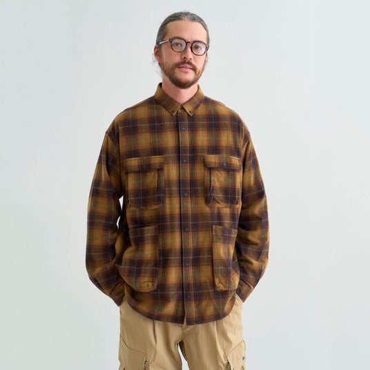 4つのポケットやスナップボタンによる開閉など、利便性に特化したキャンプシャツ。その生地のバリエーションとして、ソフトな肌触りのフランネル生地もラインナップしました。キャンプサイトでフェイドプレイド(褪せた格子模様)柄が映えること間違いなし。