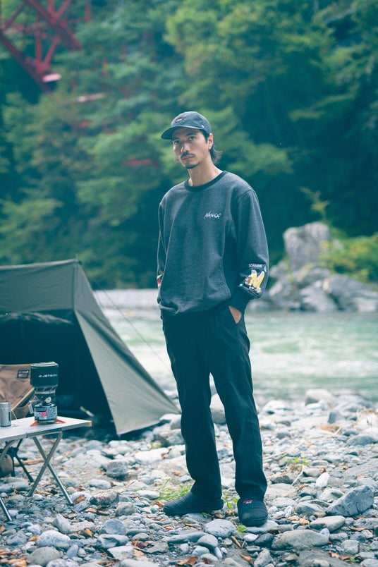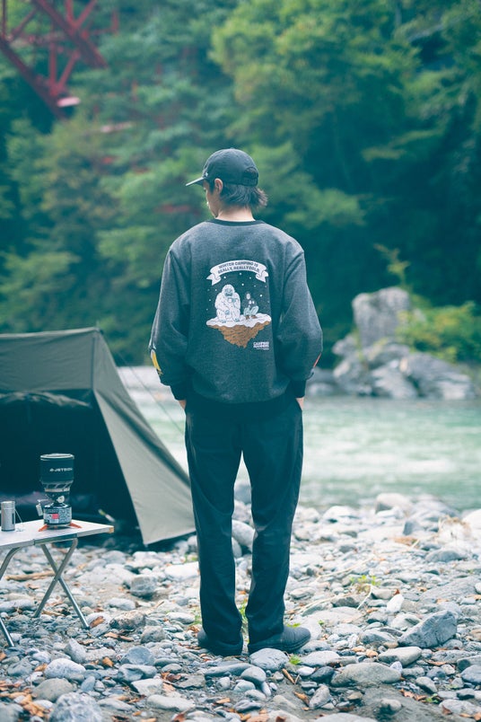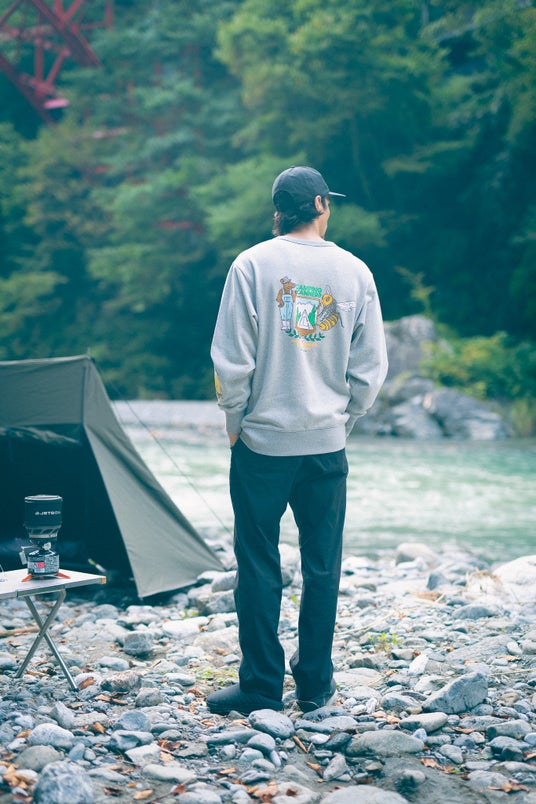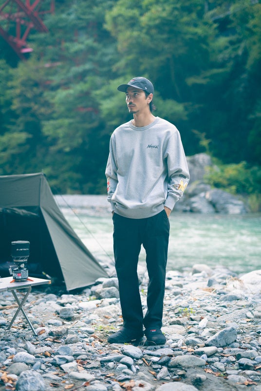 ボディーにはリサイクルの国際基準「GRS認定」を取得しているリサイクルコットンを使用したNANGA定番のECO HYBRIDシリーズのスウェットシャツを採用し、環境や自然へ配慮したサスティナブルな1着に。