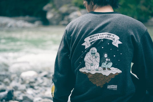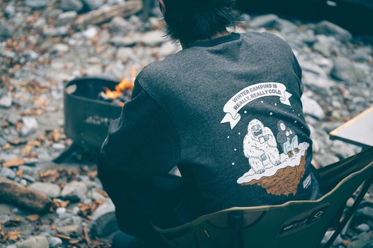キャンプ時のマナーを提唱する人気シリーズ。今シーズンは両袖にシリーズの共通ロゴを配置し、バックには3つの異なるメッセージをプリントしました。雪男が登場するこちらは、「冬キャンプはしっかり準備して快適に過ごしましょう」というテーマです。